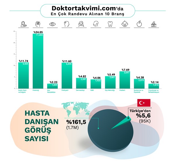 DoktorTakvimi üzerinden en çok randevu alınan 10 branş ise Psikoloji (%24.05), Kadın Hastalıkları ve Doğum (%11.74), Psikiyatri (%11.60), Pediatri (%7.69), Diş Hekimliği (%5.49), Dermatoloji (%4.82), Beslenme ve Diyetetik (%4.38), Göz Hastalıkları (%2.23) ile Fizyoterapi ve Rehabilitasyon (%2.14) oldu. Platform üzerinden 95 bin hasta/danışan ise randevusuyla ilgili platform üzerinden görüş ve değerlendirme bildirdi.