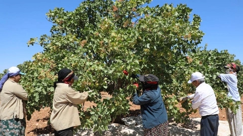 Sabahın ilk ışıklarında gruplar halinde fıstık bahçelerine giren işçiler, 45 dereceyi bulan sıcaklara rağmen akşam saatlerine kadar çalışıyor. Ağaçların dallarından tek tek fıstıkları toplayan işçiler, bir alana yığdıkları yaş fıstıkları kasalara dolduruyor.