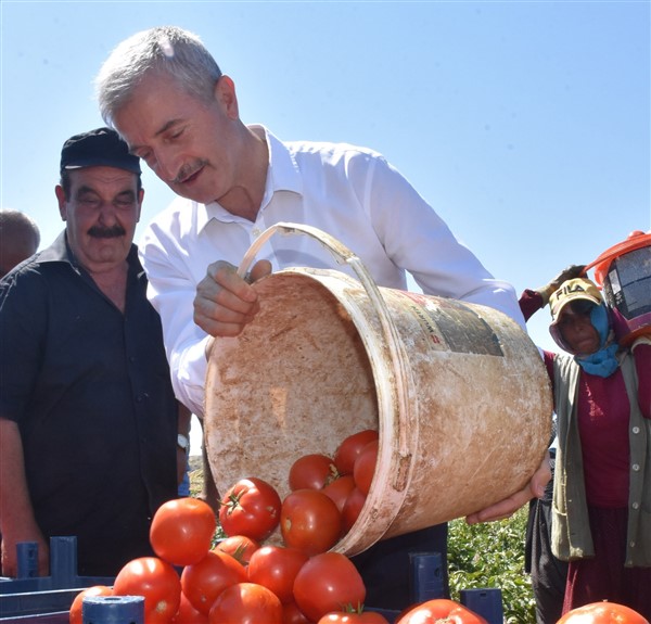 Çiftçilere toplam 43.500.000 adet domates, biber, salatalık, patlıcan ve kavun fidesi dağıtan Başkan Mehmet Tahmazoğlu, çiftçiler ile birlikte domates toplayıp, sohbet etti.