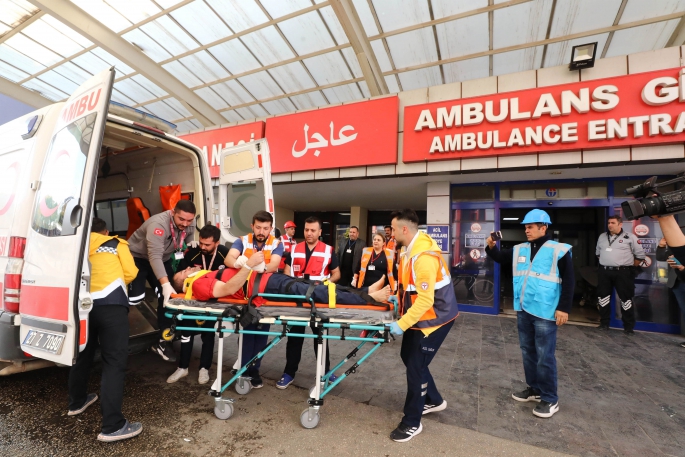 Senaryo gereği dış kaynaklı çoklu yaralanma nedeniyle acil servise gelen hastalar, erişkin acil servis ekibinin hızlı ve etkin müdahalesiyle kontrol altına alındı.