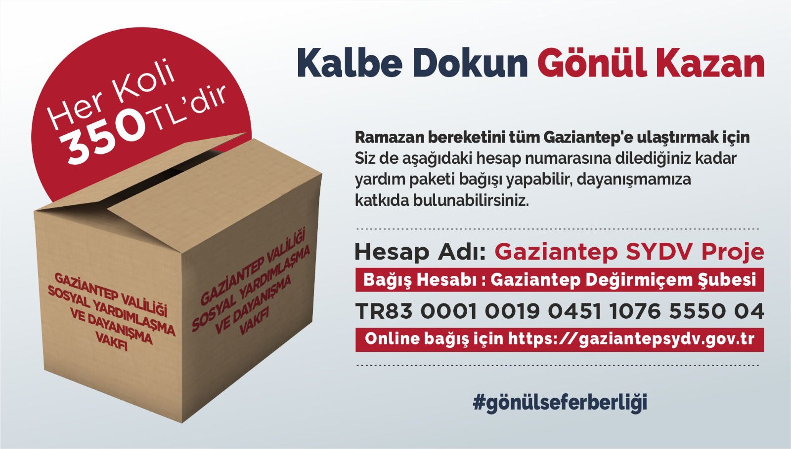 Kampanyaya katılmak isteyen hayırseverlerimiz, “Gaziantep SYDV Proje” hesap adıyla Değirmiçem Şubesi TR83 0001 0019 0451 1076 5550 04 İBAN numaralı banka hesabına belirlenen koli miktarını yatırmak sureti ile ya da ayni yardımlar için Gaziantep Valiliği ile irtibata geçmek sureti ile kampanyaya dahil olabilecek.