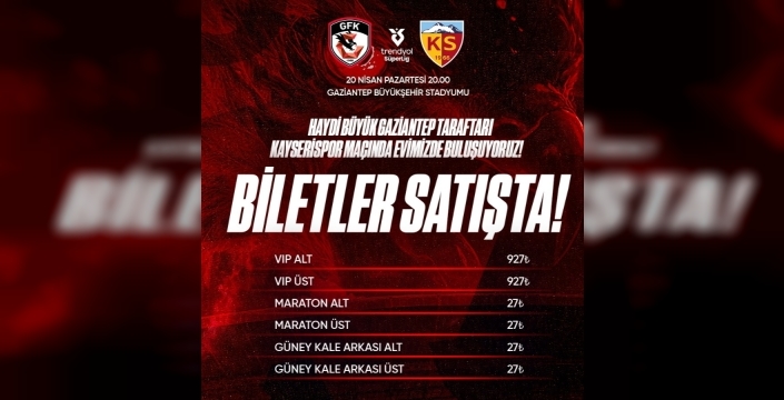 Gaziantep Büyükşehir Stadyumu'nda oynanacak olan karşılaşmanın bilet fiyatları, yönetim kurulumuz almış olduğu kararla birlikte, Maraton ve Kale Arkası biletleri şehrimizin plaka kodu olan 27 TL’den satışa sundu.