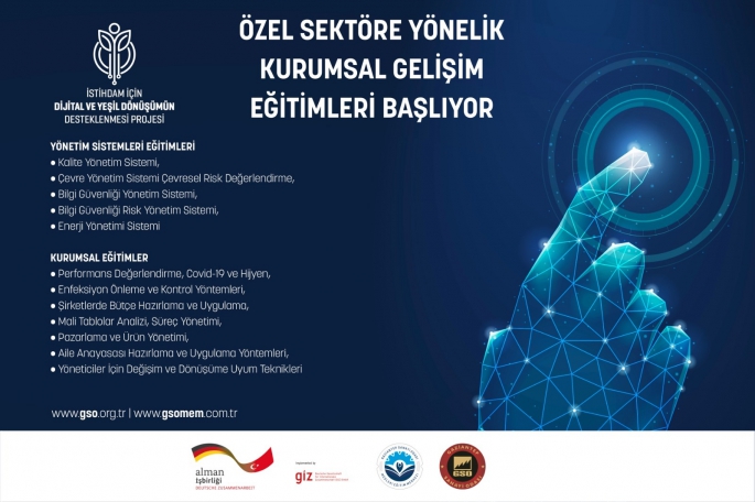 Gaziantep Sanayi Odası (GSO) ve Alman Uluslararası İş Birliği Kurumu (GIZ) ortaklığında yürütülen, Alman Federal Ekonomik İş Birliği ve Kalkınma Bakanlığı (BMZ) tarafından finanse edilen İstihdam İçin, “Dijital ve Yeşil Dönüşümün Desteklenmesi Projesi” kapsamında KOBİ Gelişim Eğitimleri başlıyor.