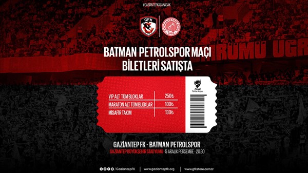 Gaziantep Kalyon Stadyumu'nda oynanacak olan karşılaşmanın bilet fiyatları 100 ile 250 TL arasında belirlendi. Taraftarlarımız passolig kartlarına www.passo.com.tr adresinden ve Demokrasi Meydanı yanında bulunan Gaziantep FK Passolig noktasından bilet dolumu yapabileceklerdir.