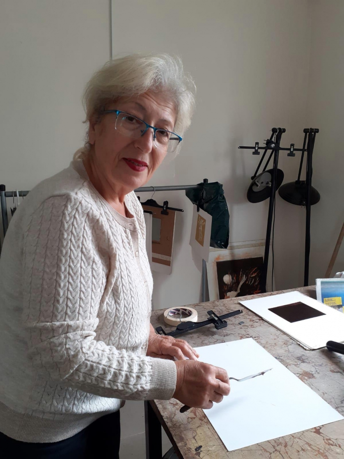 Emine Özdemir, 59’uncu kişisel resim sergisinde 25 eserin yer alacağını belirterek, çalışmalarında özgün baskı tekniklerinden ağaç baskı ve linol baskı tekniğini kullandığını söyledi.