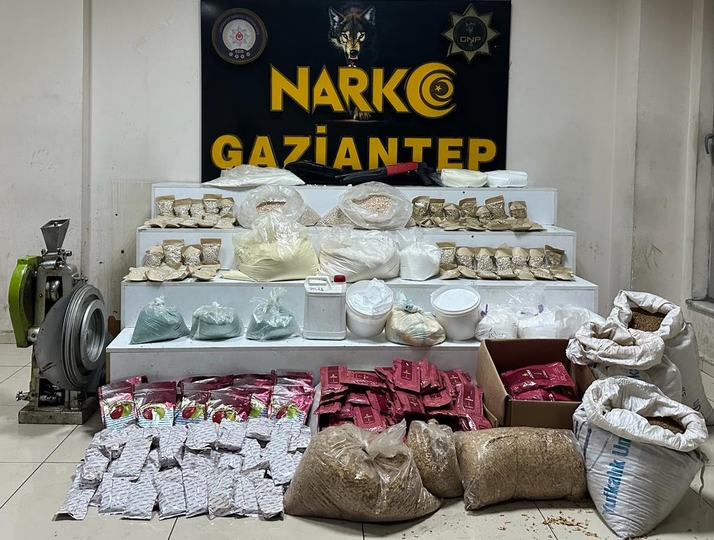 Gaziantep Narkotik Suçlarla Mücadele Şube Müdürlüğü bir depoya yapılan operasyonda; 193.000 adet captagon hap, 79 kilo 350 gram captagon yapımında kullanıldığı değerlendirilen kimyasal toz madde, 12,25 gram plaka esrar, Captogon hap yapımında kullanılan tablet pres makinesi, 2 adet pompalı tüfek, 94 kilogram nargile tütünü, 40 kilogram tütün, 30.000 ₺ ele geçirildi,